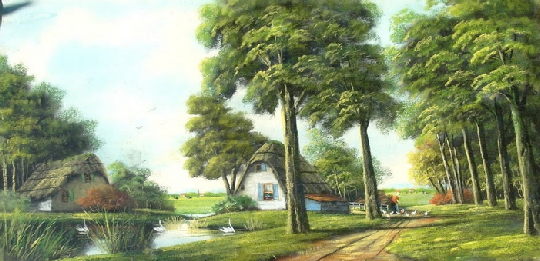 Ik fiets het dorp in en kom bij de kerk, waar nu alles rustig is. Dat was gisteren wel anders. Rond de kerk stond van alles uitgestald en was het vol met kooplustige mensen. Nadat de rommelmarkt al afgelopen was, viel m’n oog nog op een stukje van een mooi oud schilderij. Als dat stukje al zo mooi was, dan zou de rest ook wel mooi zijn. Ik ben teruggelopen en kon het gelukkig nog kopen. En de rest was ook mooi; een oud tafereeltje met een bomenlaan, twee boerderijen en een vijver. Bij thuiskomst zag ik dat het een echt schilderij was. Het is een gekrijt schilderij, gemaakt door J. v Dalen. Is het kunst of is het kitsch? In ieder geval vind ik het prachtig.